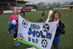De schoolvoetbal juich cup is in 2016 gewonnen door de Holm met een geweldige Yell. 2 mascottes en 2 spandoeken.