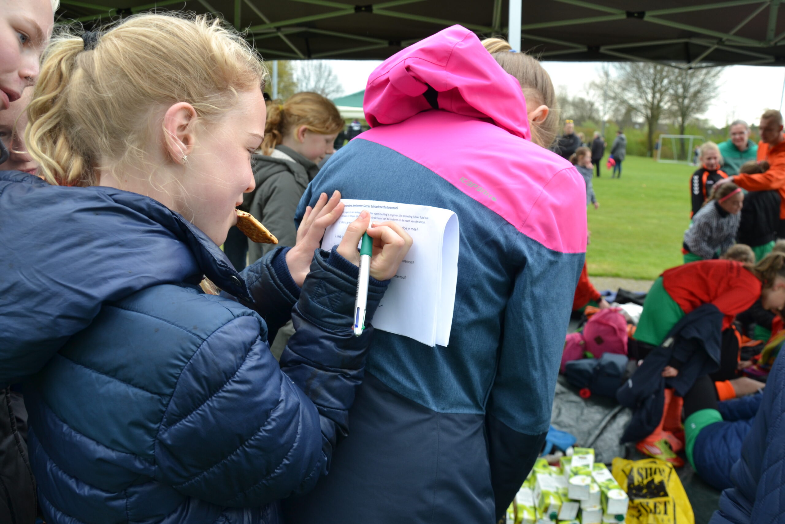 Nienke van De Holm is 10 jaar E1 en heeft al vaker meegedaan aan het schoolvoetbaltoernooi. Vorig jaar wonnen ze de juichcup. Ze zit ook op voetballen bij Roda. Ze vindt het leuk dat ze nu met haar klas kan voetballen en dat je dingen kan kopen zoals patatjes. Alles is leuk van vandaag. Leuk georganiseerd.